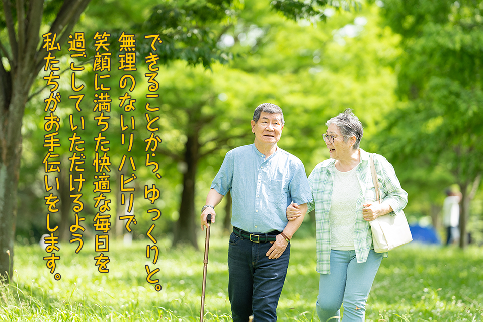できることから、ゆっくりと。 無理のないリハビリで笑顔に満ちた快適な毎日を過ごしていただけるよう私たちがお手伝いをします。